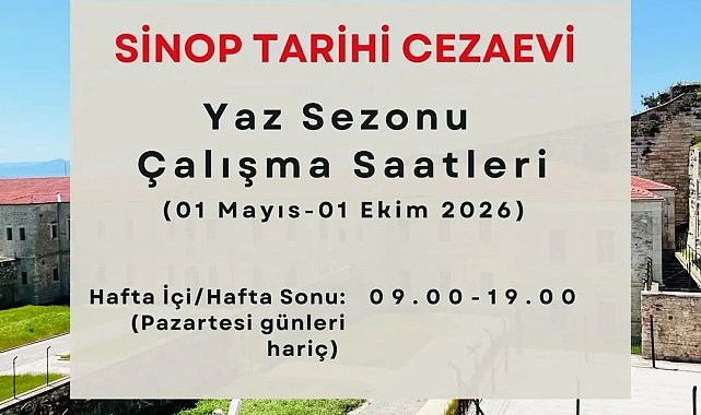 Türkiye'nin en çok ziyaret edilen tarihi mekanlarından biri olan Sinop Tarihi Cezaevi ve Müzesi'nde, 1 Mayıs itibarıyla yaz sezonu çalışma saatleri uygulamasına geçiliyor.Sinop İl Kültür ve Turizm Müdürlüğü tarafından yapılan duyuruya göre, kentin simge yapılarından biri olan ve yerli-yabancı turistlerin uğrak noktası konumundaki Tarihi Cezaevi'nin ziyaret saatleri güncellendi. 01 Mayıs - 01 Ekim 2026 tarihleri arasında geçerli olacak yeni düzenlemeye göre, müze kapılarını sabah 09.00'da açacak ve akşam 19.00'a kadar ziyaretçilerini ağırlamaya devam edecek.Yaz sezonu boyunca hafta içi ve hafta sonu ayrımı olmaksızın uygulanacak mesai saatlerinde, müzenin rutin bakım ve temizlik çalışmaları nedeniyle pazartesi günleri kapalı olacağı bildirildi.