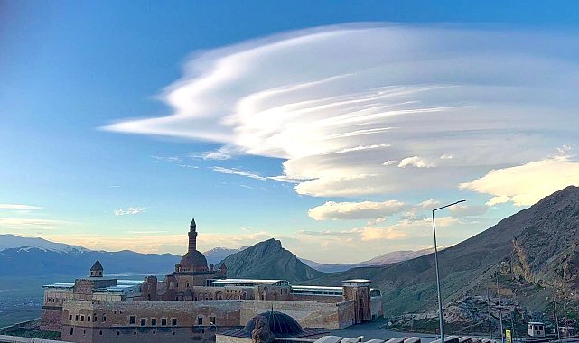Ağrı'nın Doğubayazıt ilçesinde İshak Paşa Sarayı üzerinde oluşan mercek bulutları, gökyüzünde görsel şölen sundu.Ağrı'nın Doğubayazıt ilçesinde etkili olan mercek bulutları, tarihi İshak Paşa Sarayı çevresinde göz kamaştıran görüntüler oluşturdu. Gökyüzünde tabaka halinde dizilen ve tabağı andıran şekilleriyle bilinen bulutlar, sarayın üzerinde örtü gibi konumlanırken, ortaya çıkan manzara kartpostalları aratmadı. Ağrı Dağı çevresinde de gözlemlenen bulutlar, gökyüzünde eşsiz görüntüler oluşturdu.