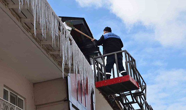 Tercan Belediyesi ekipleri, ilçe genelinde bina saçaklarında oluşan buz sarkıtlarını temizledi.
