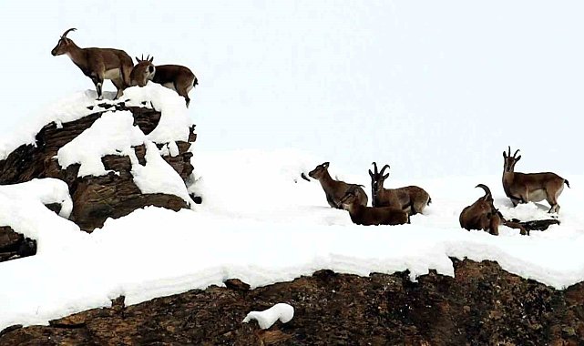 Erzincan'da zirvesi karla kaplı 3 bin rakımlı dağda sürüler halinde gezinip yiyecek arayan, avlanması yasak ve koruma altındaki tür olan dağ keçileri havadan görüntülendi.